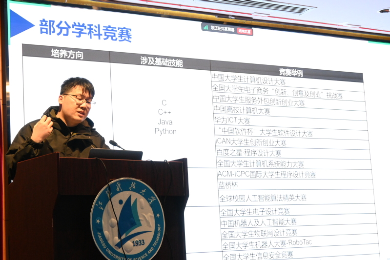 随后,来自镇江互联网行业企业代表许文哲老师,详细阐述了高校竞赛的相关内容,并深入剖析了其重要意义。他指出,竞赛不仅能帮助学生提升专业技术,还对升学和就业起到重要作用。他建议学生根据自身兴趣选择合适的参赛方向,如个人赛侧重编程实力,团队赛则更注重协作与沟通能力。他同时提醒大家,在备赛过程中会遇到诸多挑战,唯有通过不断地努力和学习,方能在竞赛的洗礼中收获成长与蜕变。