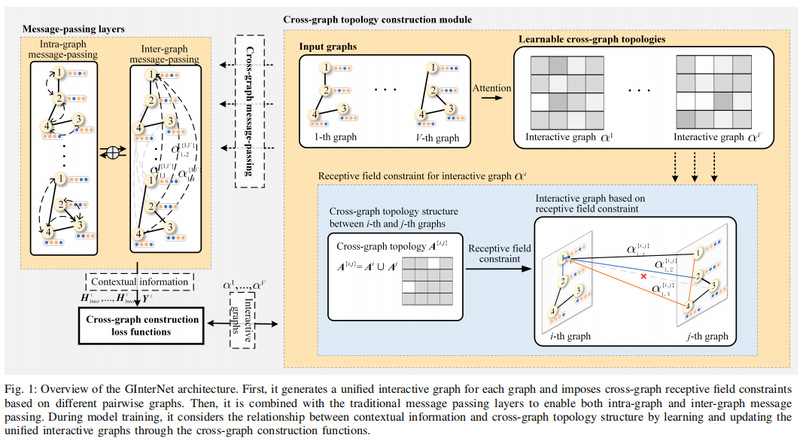 论文中,研究者设计了一种跨图交互网络(GInterNet),突破传统图神经网络局限于单图内部学习的限制。GInterNet通过构建和更新跨图拓扑,探索图间节点之间的潜在关联。论文还提出了一种适配于跨图拓扑的消息传递新范式,通过聚合不同图之间的上下文信息,实现了跨图节点交互。这一跨图的拓扑学习、信息聚合与动态更新三位一体的新型交互范式,实现了多图的表示学习。